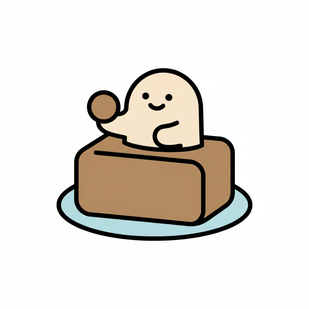 Niedliche, lächelnde Cartoon-Figur, die aus einem braunen Block auf einem blauen Teller kommt und etwas hält.