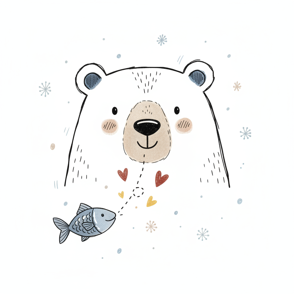 Niedlicher Cartoon-Eisbär mit roten Wangen, der liebevoll einen Fisch ansieht, umgeben von Schneeflocken.