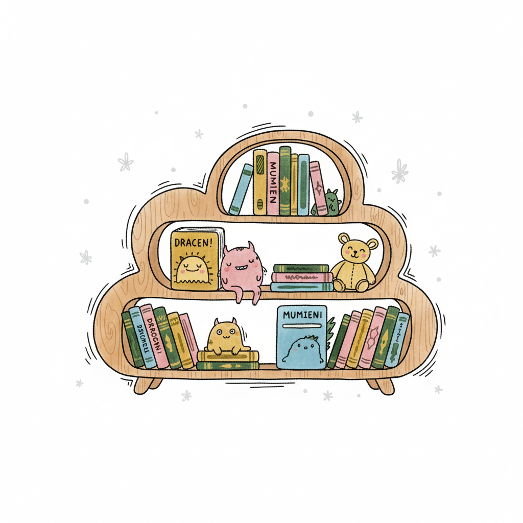 Niedliches Wolkenregal voller Bücher und kleiner Monster, umgeben von Sternen.