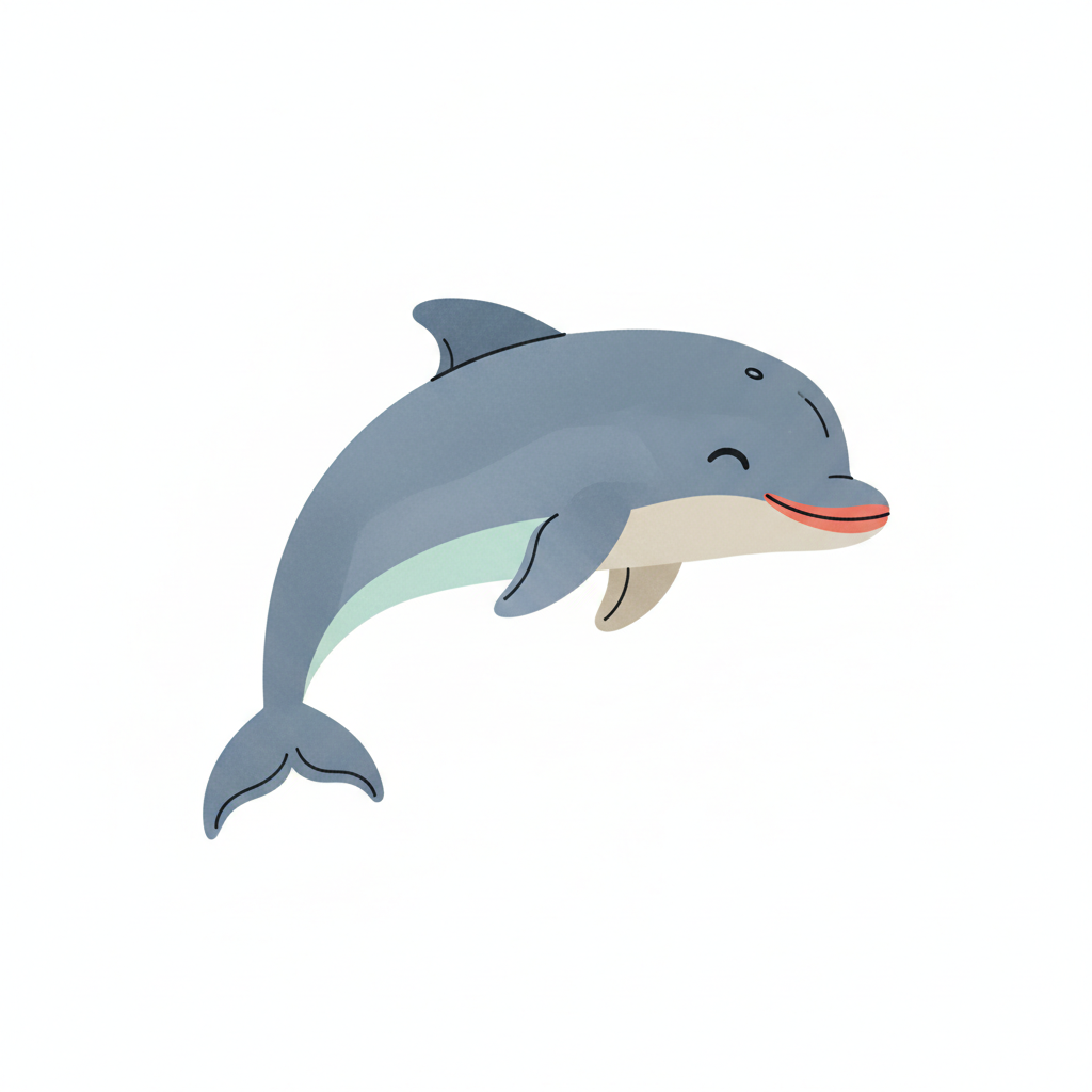 Ein fröhlicher Delphin schwimmt lächelnd im Wasser.