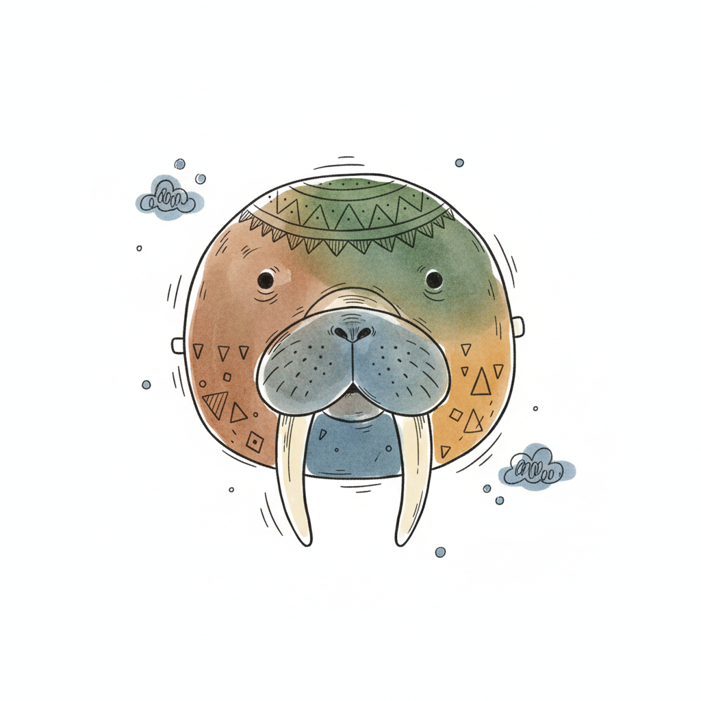 Niedliche Aquarell-Illustration eines Walrosskopfes mit geometrischen Mustern und Stoßzähnen.
