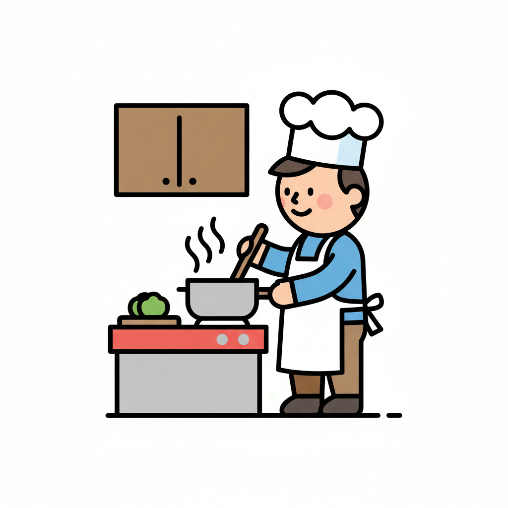 Ein lächelnder Cartoon-Koch rührt in einem dampfenden Topf auf dem Herd in der Küche.