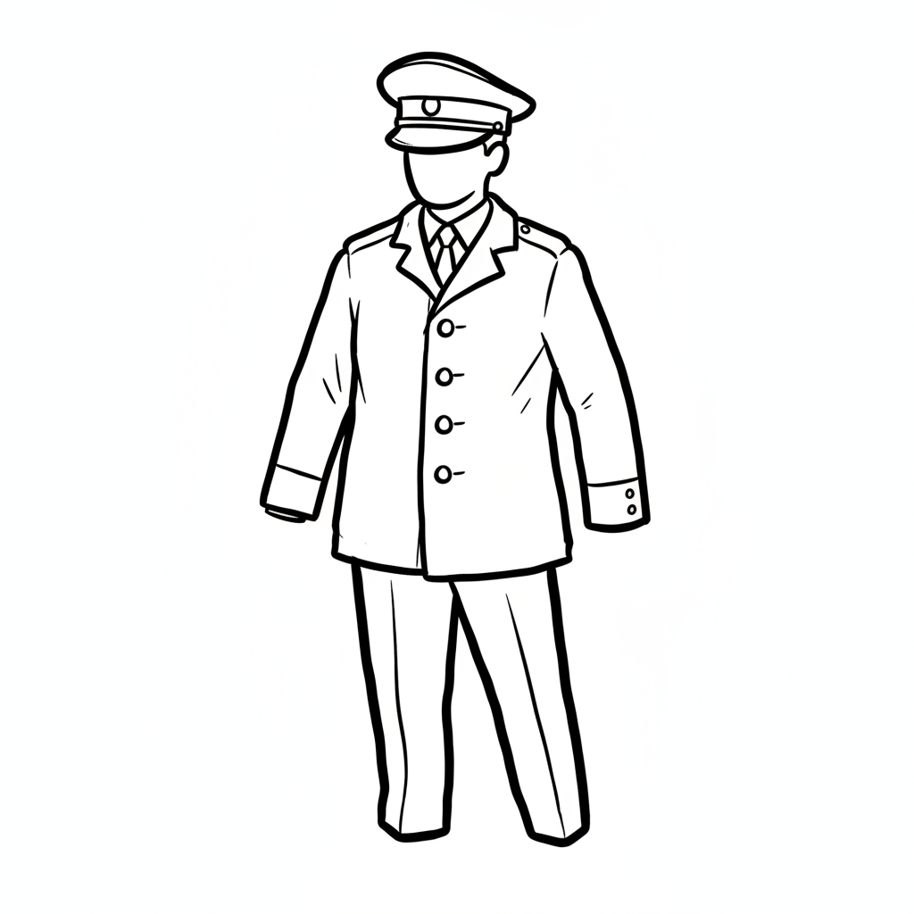 Schwarz-weiße Strichzeichnung einer Person in Uniform mit Mütze, Jacke und Hose.