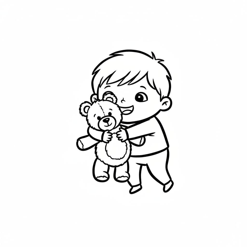 Niedlicher Junge umarmt lächelnd seinen Teddybär. Schwarz-Weiß-Cartoon für Kinder.