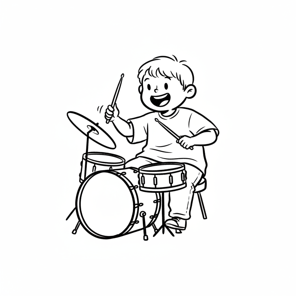 Glücklicher Junge spielt Schlagzeug. Schwarz-weiß-Illustration.