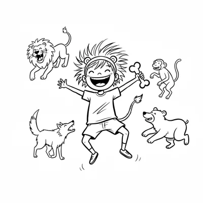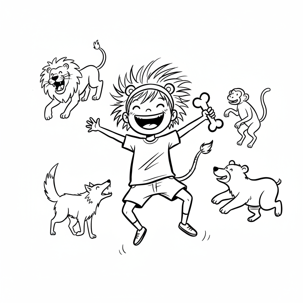 Fröhliches Kind im Löwenkostüm springt mit Knochen, umgeben von Tieren (Löwe, Affe, Wolf, Bär).