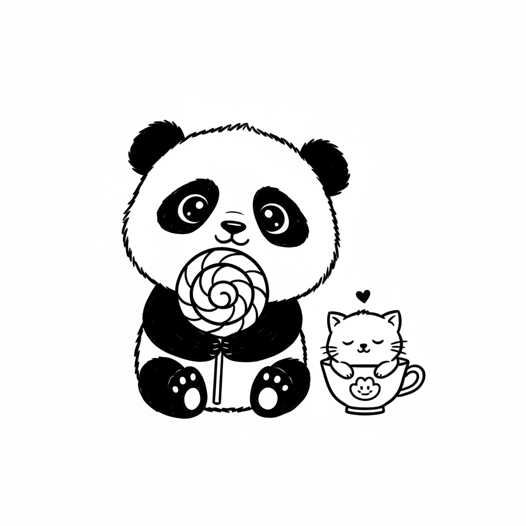 Niedlicher Panda mit Lutscher und Kätzchen in Tasse, schwarz-weiß gezeichnet.