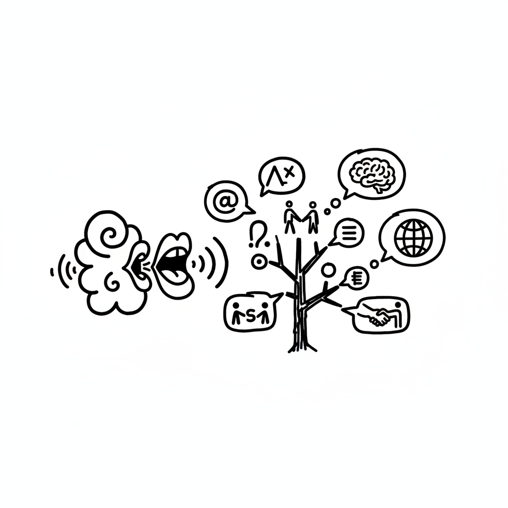 Illustration von Kommunikation: Ein Mund spricht, ein Baum verzweigt sich in Symbole für Wissen & Interaktion.