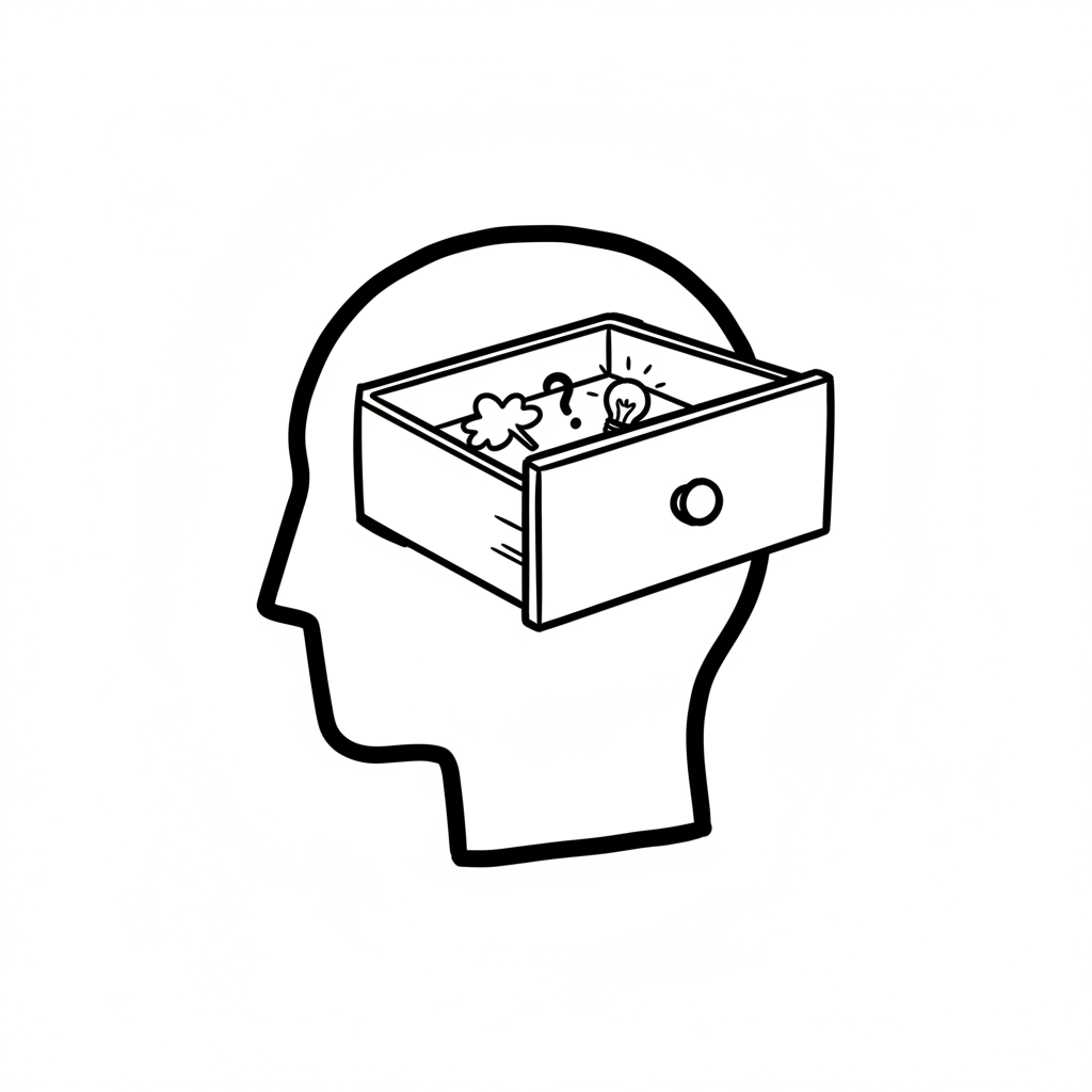 Ein Kopf mit offener Schublade, die Ideen, Fragen und Gedanken als Symbole enthält.