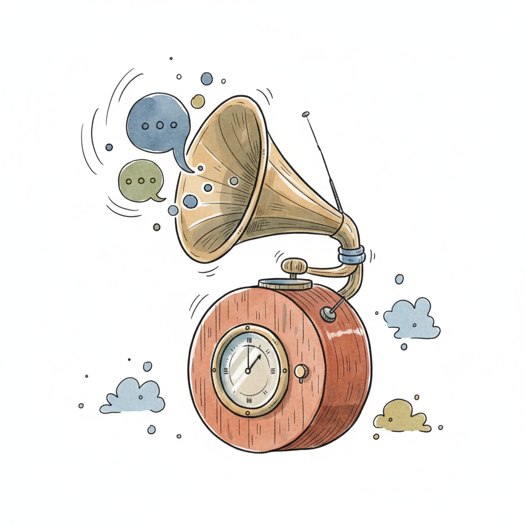 Aquarell-Illustration eines Grammofons mit Uhr und Sprechblasen, symbolisiert Kommunikation und Zeit.