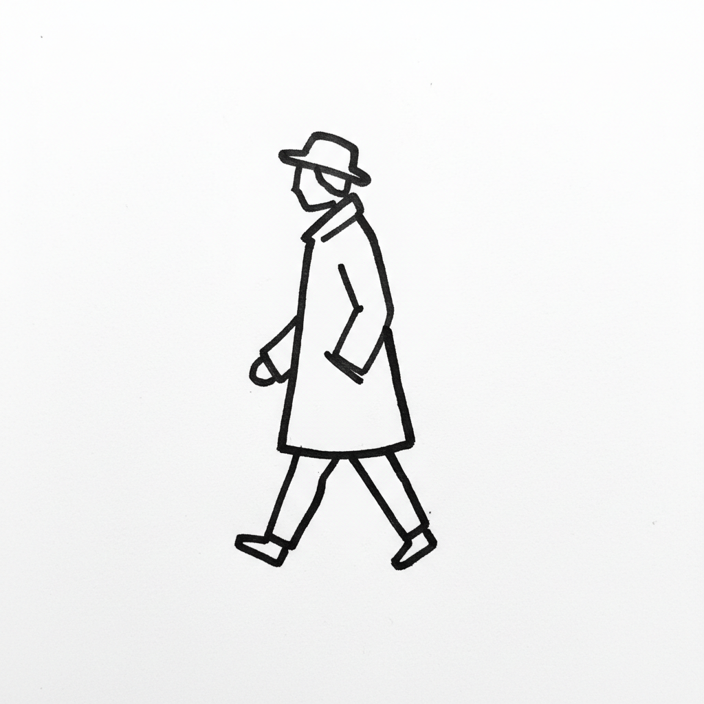 Minimalistische Strichzeichnung einer gehenden Person mit Hut und Mantel auf weißem Hintergrund.