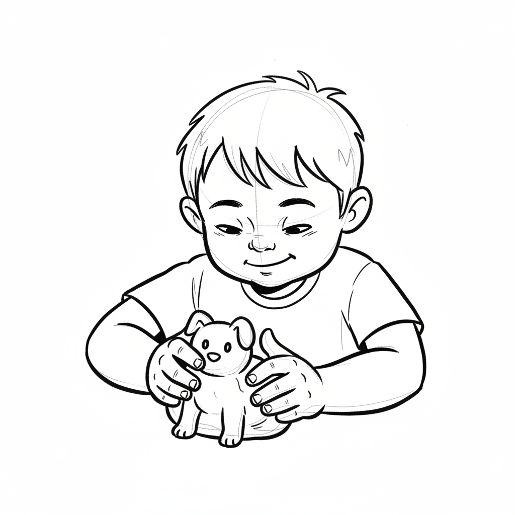Glücklicher Junge hält einen kleinen Hund. Schwarz-Weiß-Skizze.