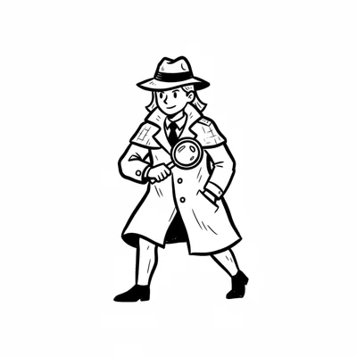Cartoon-Detektivin mit Lupe und Trenchcoat, schwarz-weiß gezeichnet.