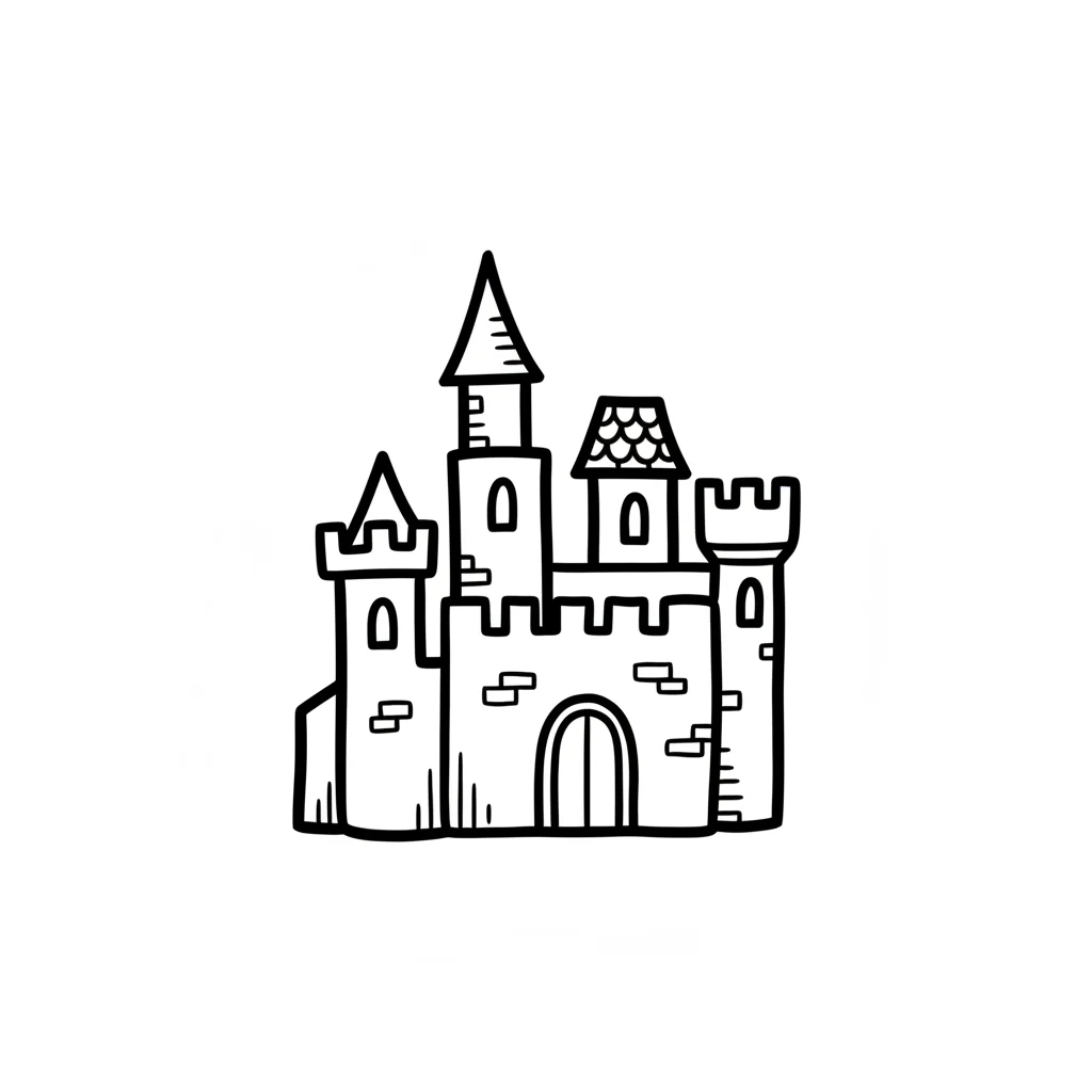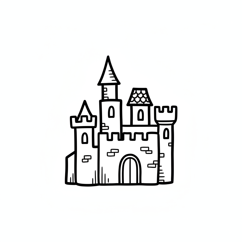 Schwarz-weiße Skizze einer Burg im Cartoon-Stil mit Türmen und Zinnen.