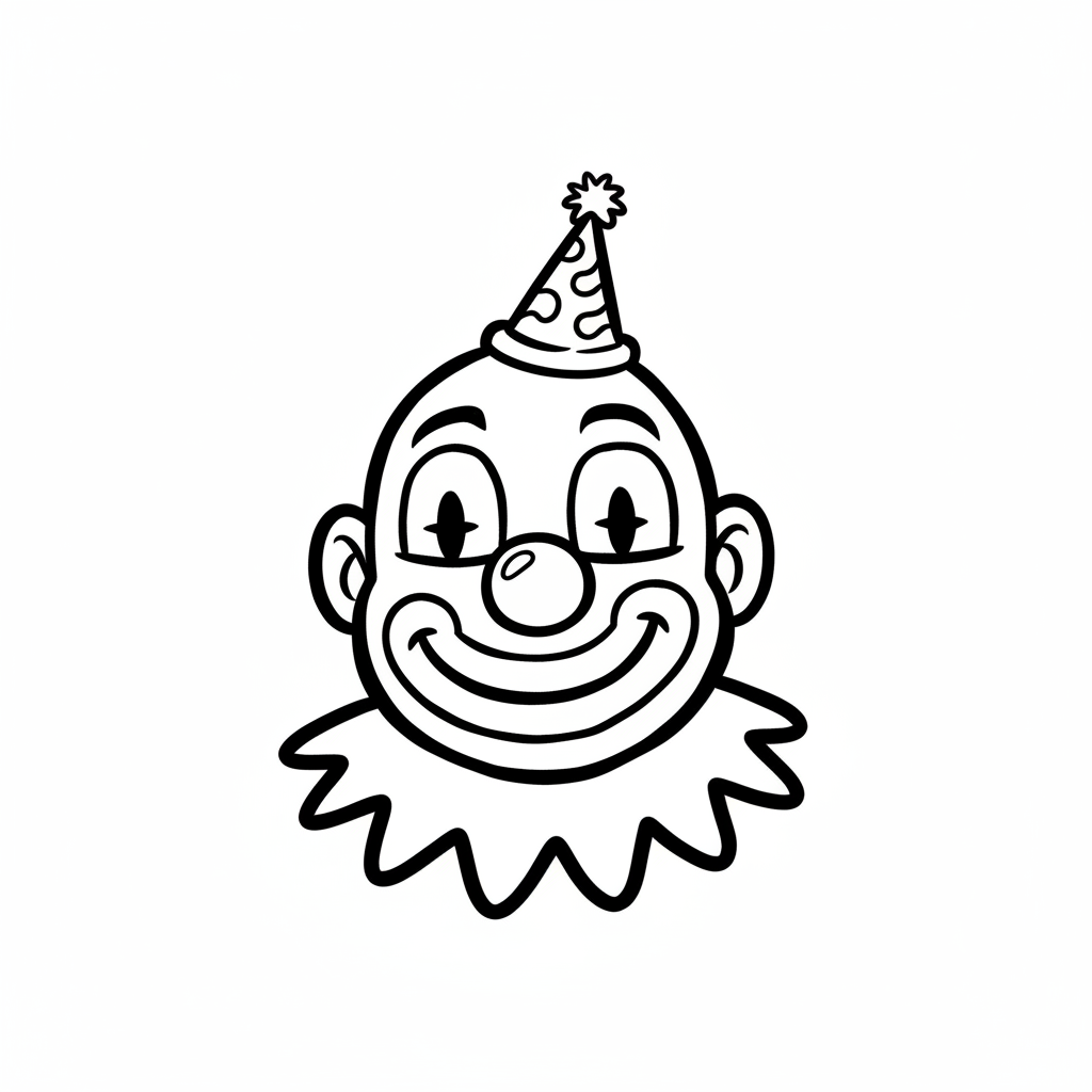 Schwarz-weiße Cartoon-Zeichnung eines lächelnden Clowns mit Partyhut und Rüschenkragen.