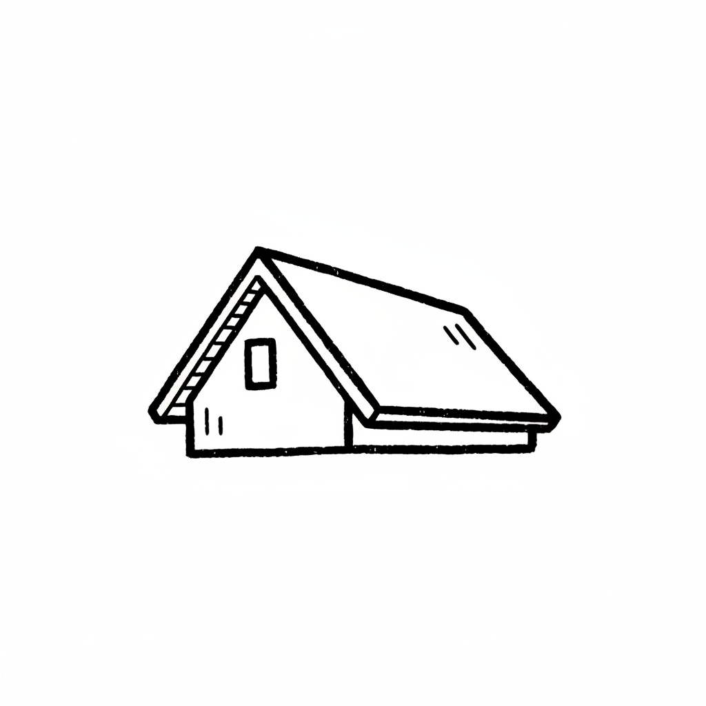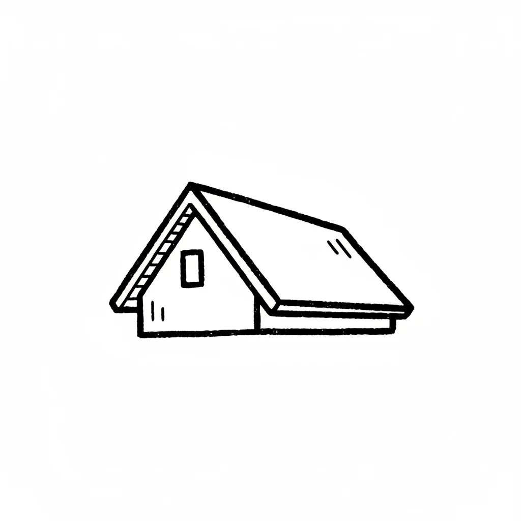 Schwarz-weiße Strichzeichnung eines kleinen Hauses mit Giebeldach und einem Fenster.