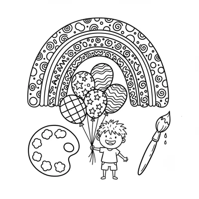 Malvorlage: Junge mit Ballons vor einem gemusterten Regenbogen, daneben Palette und Pinsel.