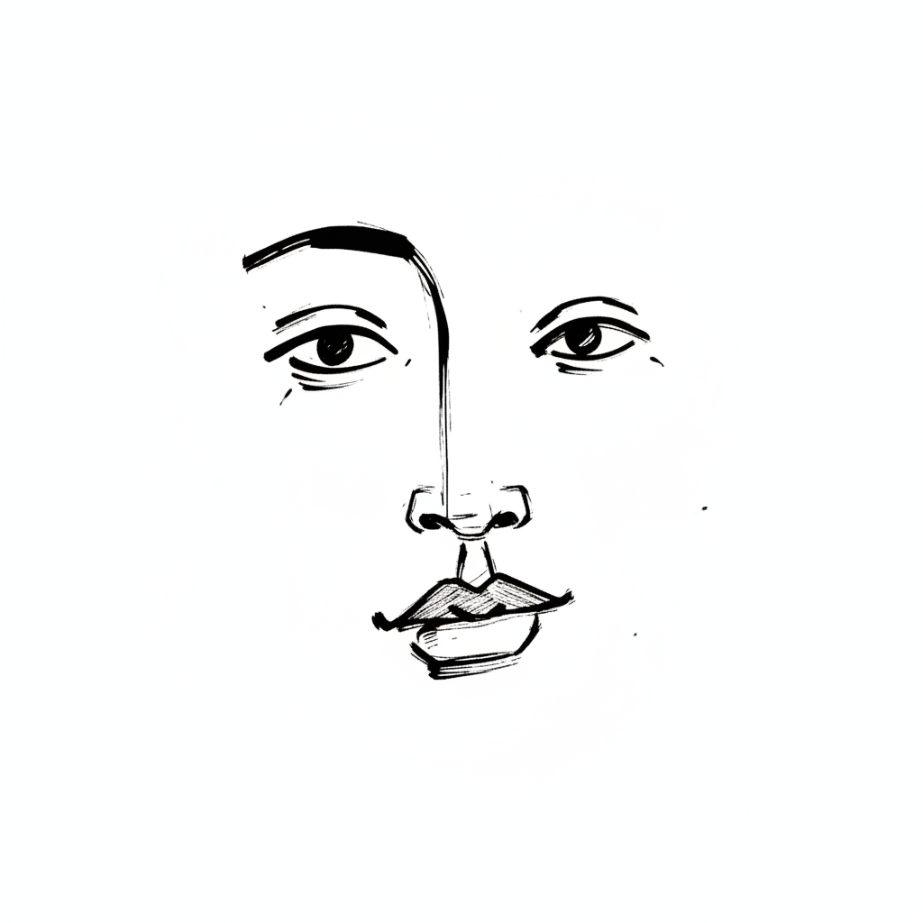 Schwarz-weiße Strichzeichnung eines Gesichts mit Augen, Nase und Mund im minimalistischen Stil.