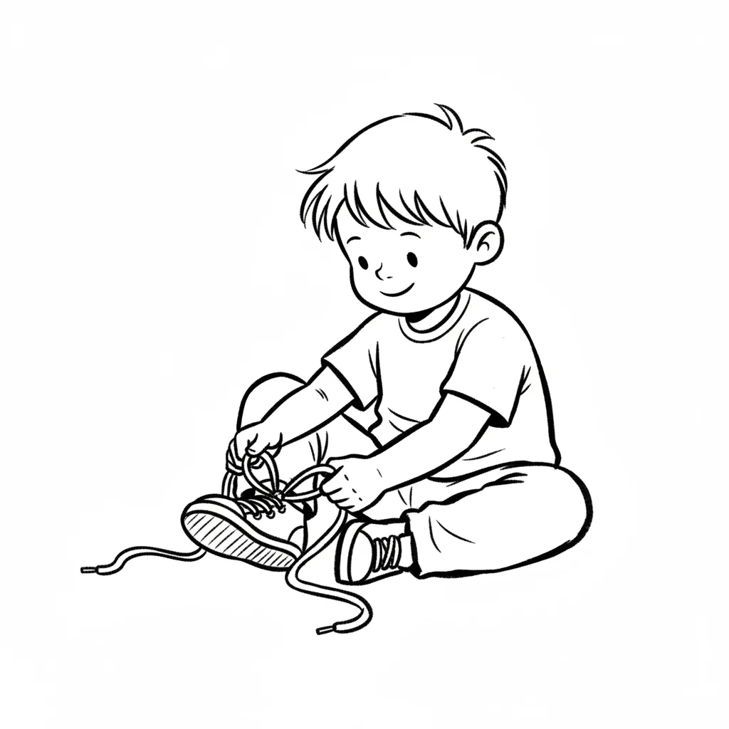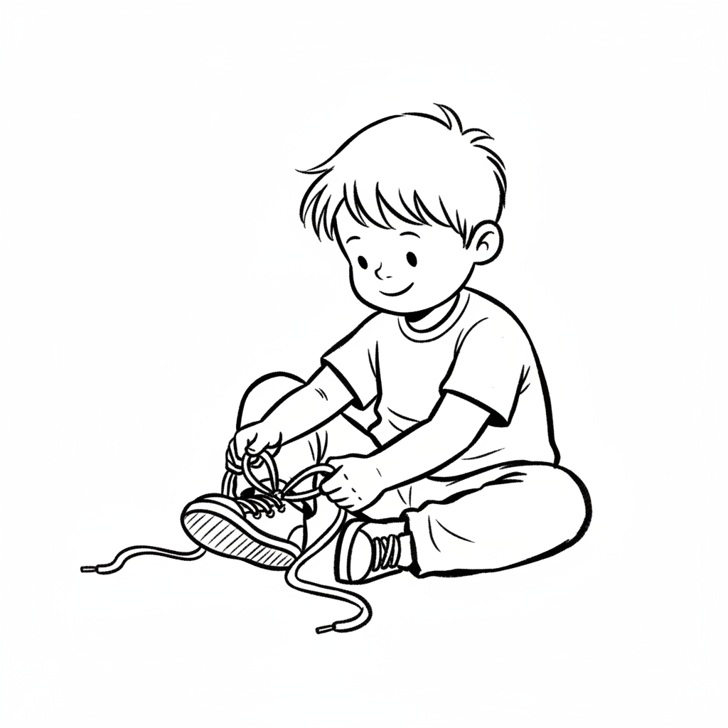 Ein kleiner Junge sitzt und bindet seine Schnürsenkel. Schwarz-Weiß-Zeichnung.