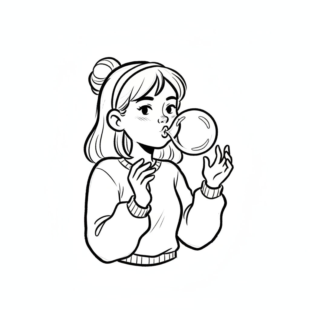 Schwarz-weiß-Illustration einer jungen Frau, die Kaugummi bläst. Sie trägt einen Pullover.
