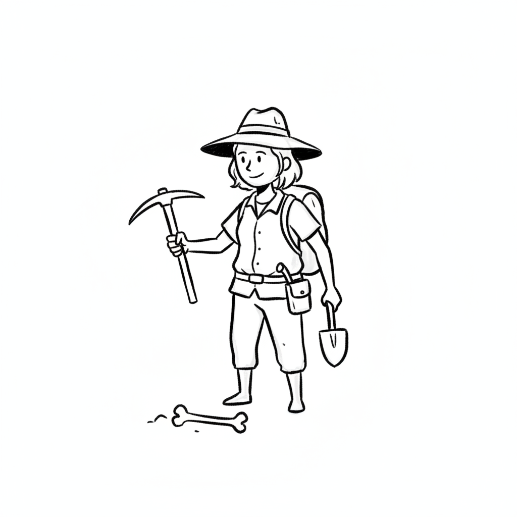 Eine lächelnde Archäologin mit Spitzhacke, Schaufel und einem Knochenfund am Boden.