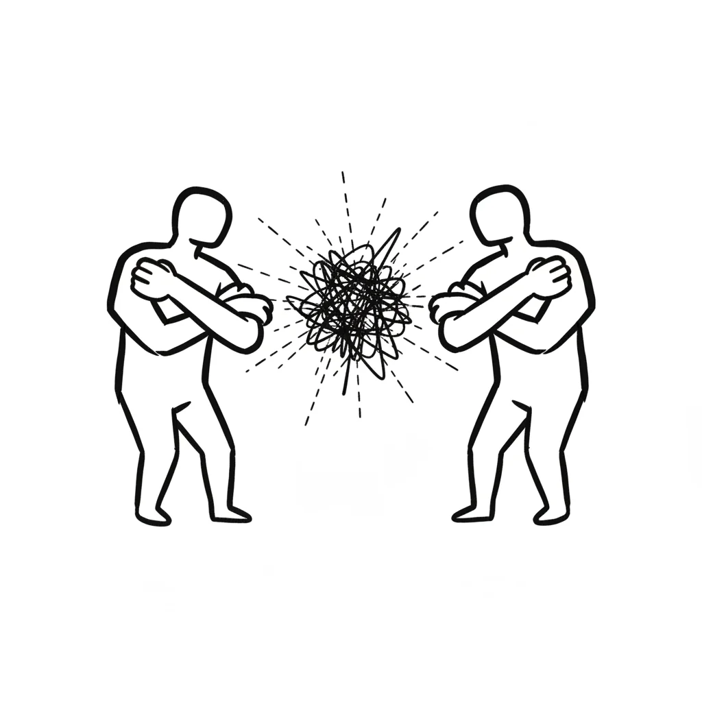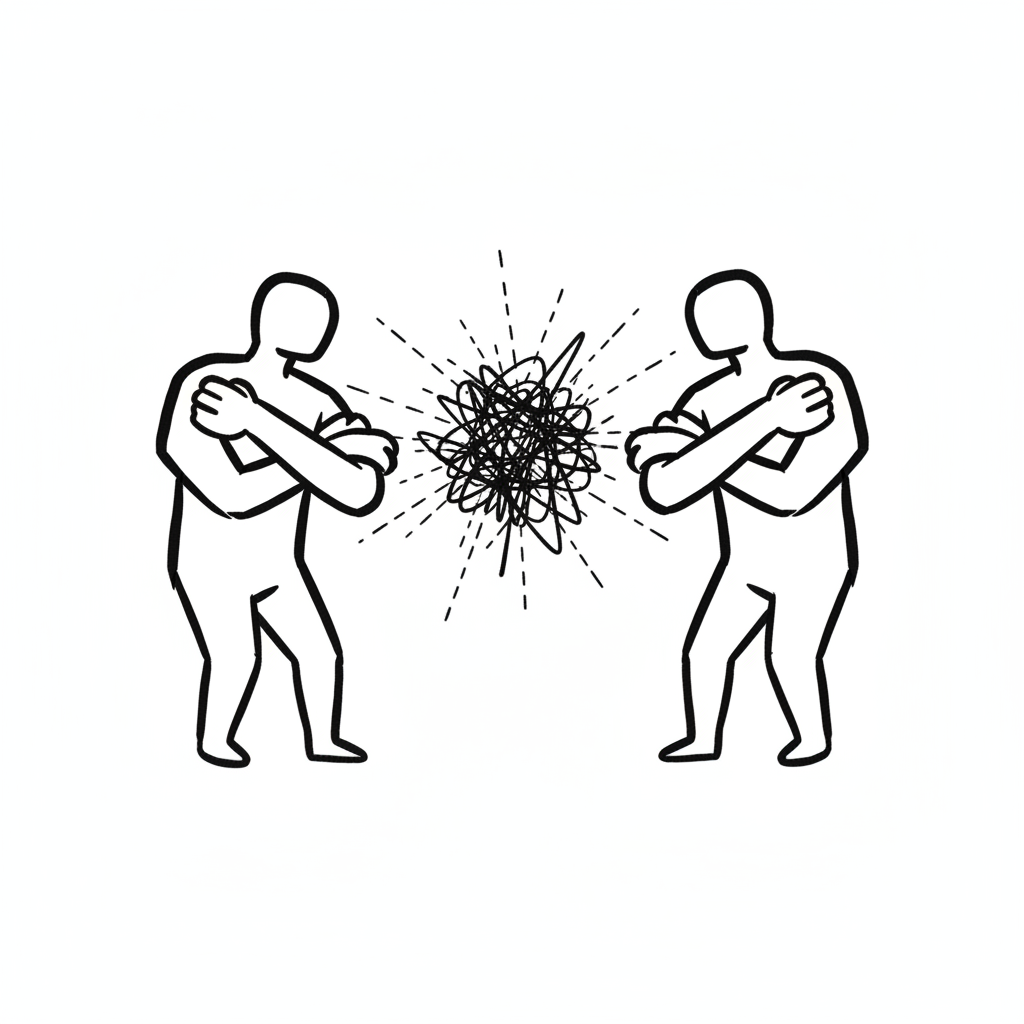 Zwei Personen mit verschränkten Armen, zwischen ihnen ein chaotisches Knäuel, symbolisiert Konflikt.