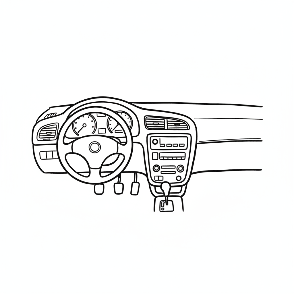 Schwarz-weiße Strichzeichnung eines Auto-Armaturenbretts mit Lenkrad, Anzeigen und Bedienelementen.