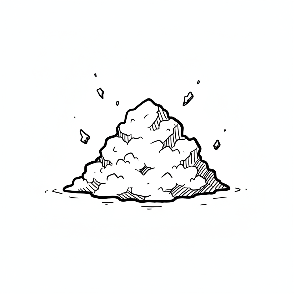 Handgezeichneter, stilisierter Schneehaufen mit umherfliegenden Partikeln auf weißem Grund.