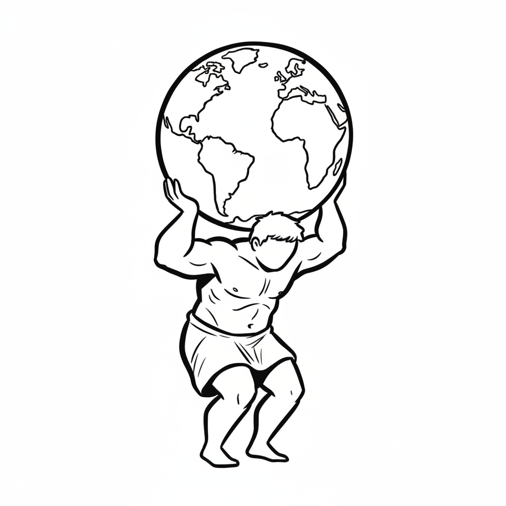 Schwarz-weiß-Zeichnung eines muskulösen Mannes, der die Weltkugel auf seinen Schultern trägt.