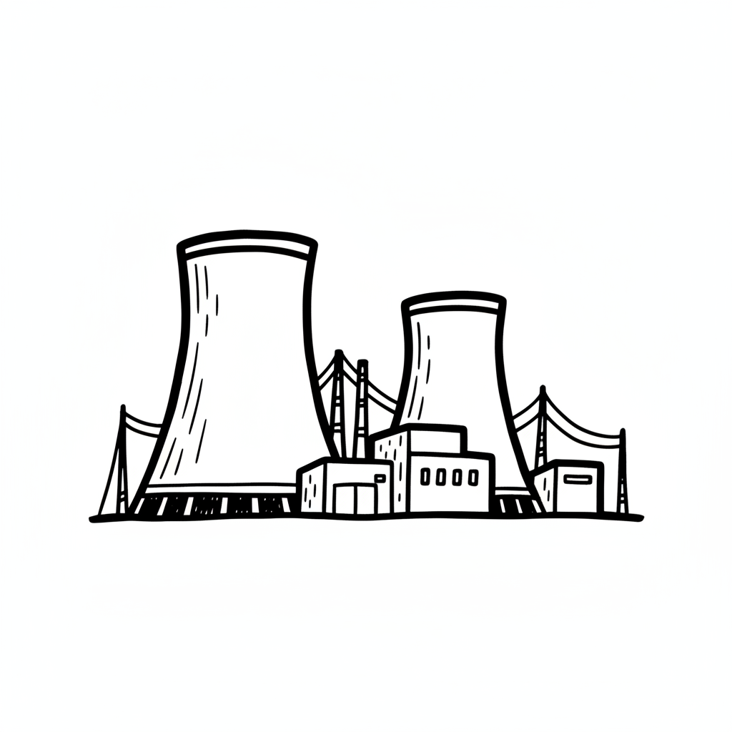 Schwarz-weiß-Zeichnung eines Atomkraftwerks mit zwei Kühltürmen, Gebäuden und Stromleitungen.