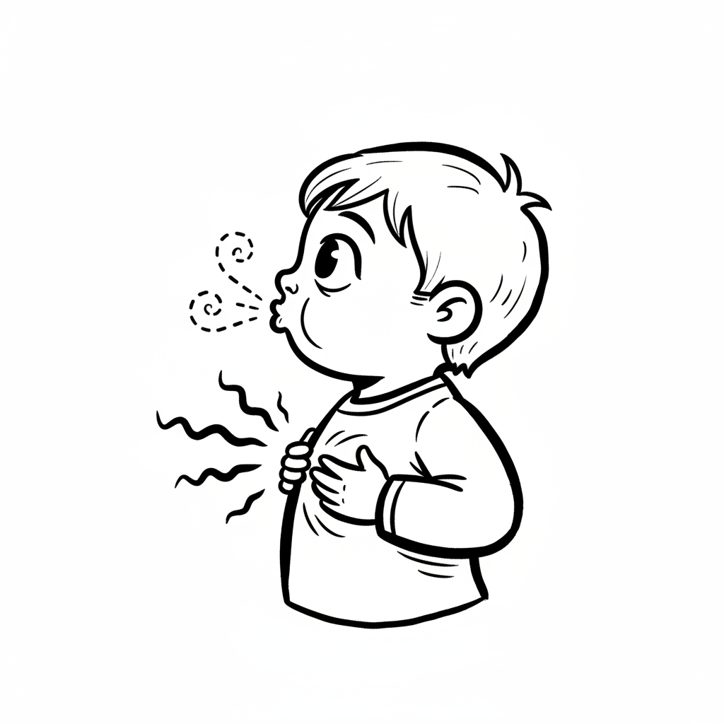 Junge bläst Luft aus, hält sich den Bauch, möglicherweise wegen Bauchschmerzen oder Aufstoßen.