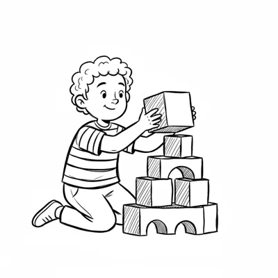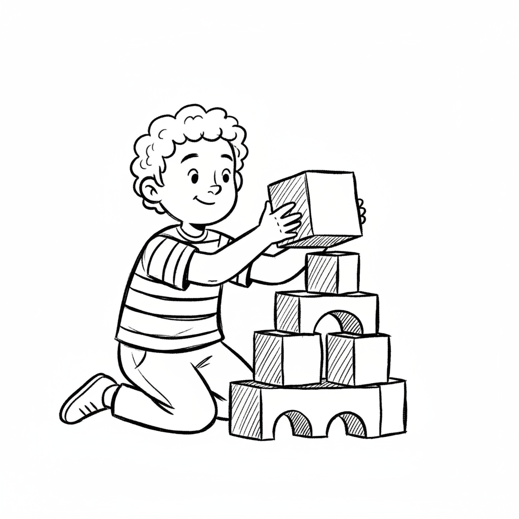 Ein lächelnder Junge baut einen Turm aus Bauklötzen. Schwarz-Weiß-Zeichnung.