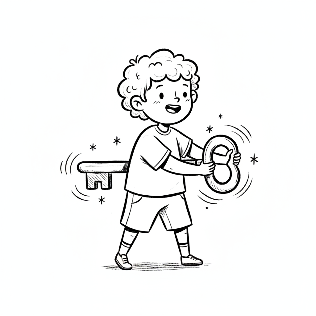 Ein lächelnder Cartoon-Junge mit einem Aufziehschlüssel im Rücken, den er selbst aufzieht.