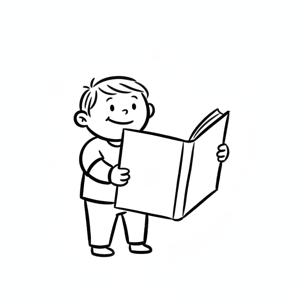 Glücklicher Junge liest ein Buch. Schwarz-weiß-Illustration.