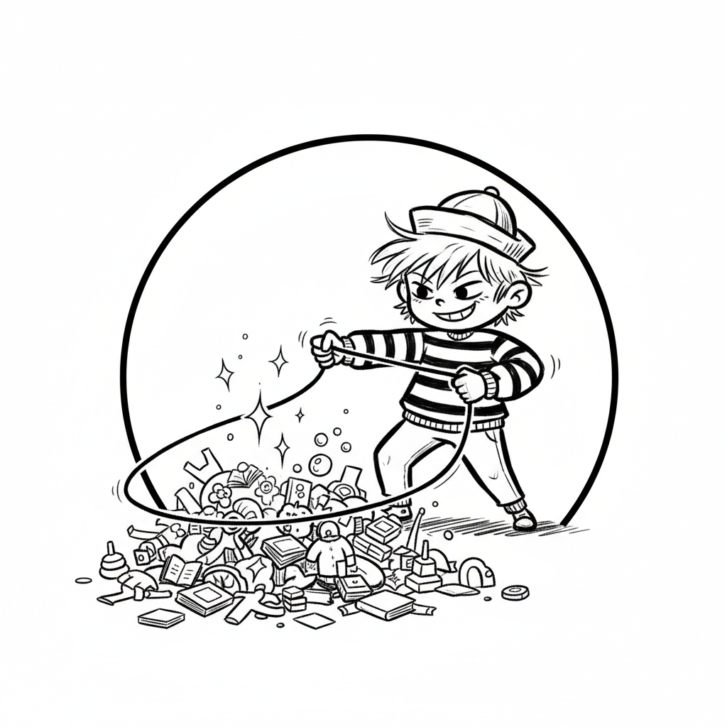 Junge in Matrosenkleidung räumt mit magischem Seil Spielzeug auf.