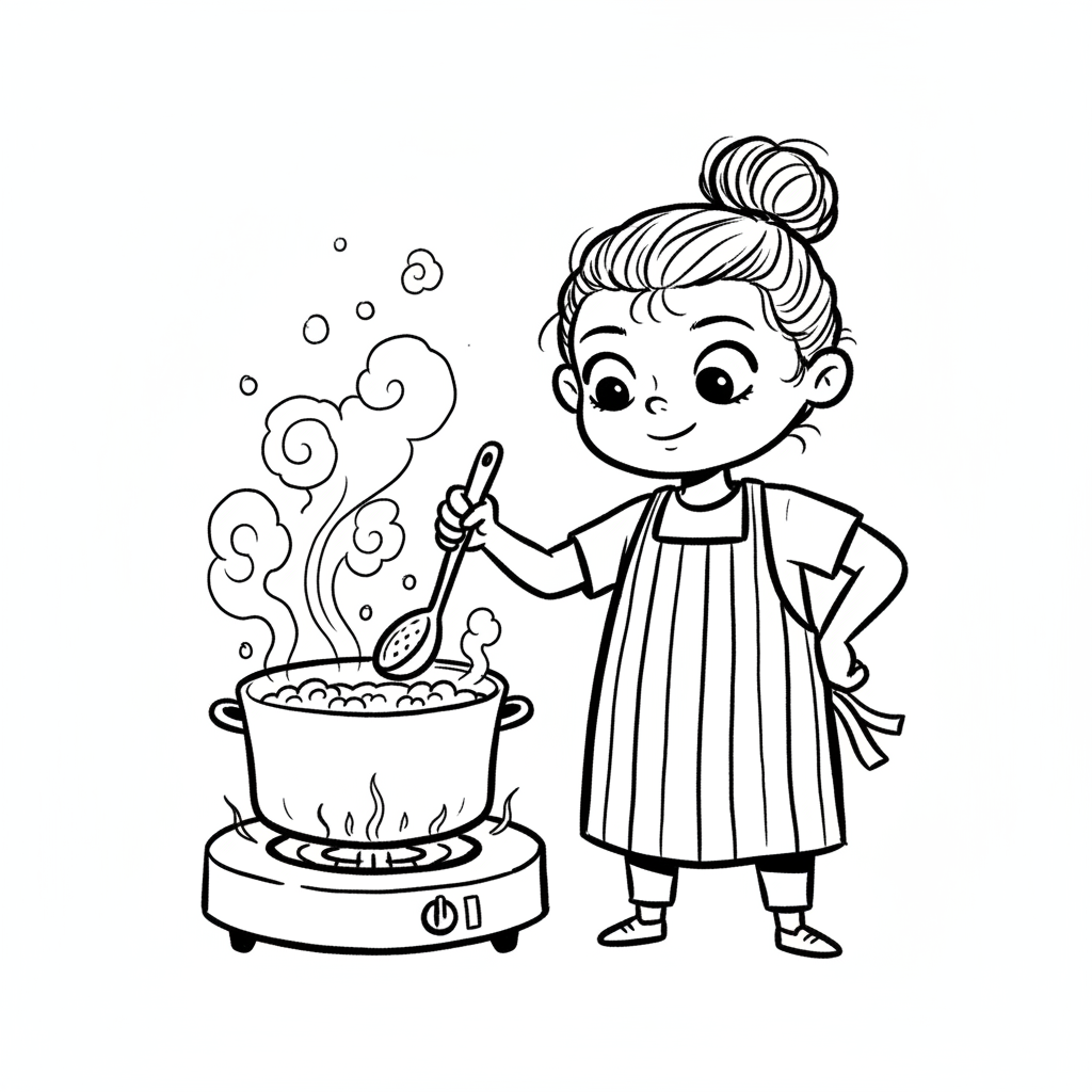 Schwarz-weiß-Zeichnung eines lächelnden Mädchens mit Schürze, das in einem dampfenden Topf rührt.