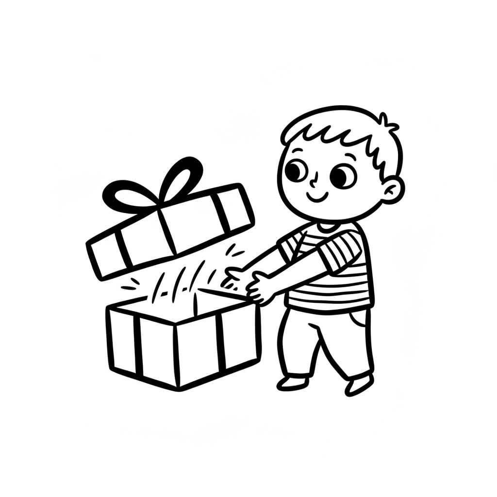 Ein lächelnder Junge öffnet ein magisches Geschenkpaket, aus dem Licht strahlt.