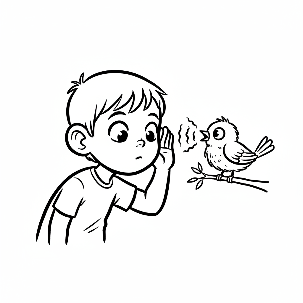Junge lauscht einem zwitschernden Vogel auf einem Ast. Schwarz-Weiß-Zeichnung.