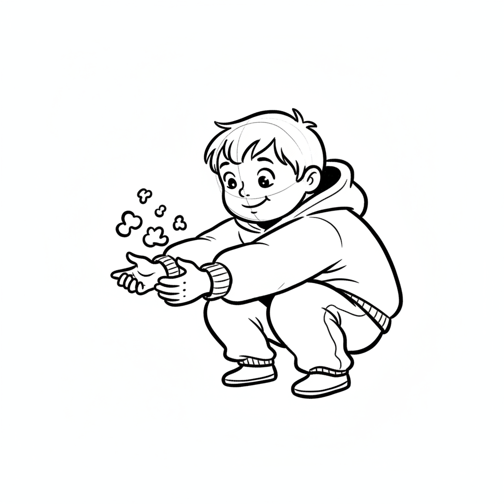 Ein lächelnder Cartoon-Junge hockt und hält seine Hände, aus denen kleine Wolken aufsteigen.