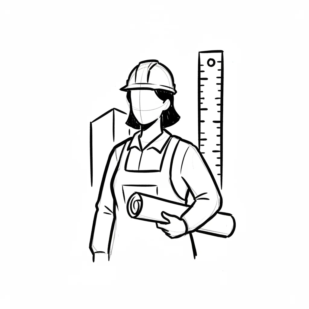 Schwarz-weiße Illustration einer Architektin/Bauarbeiterin mit Helm, Bauplan und Lineal.