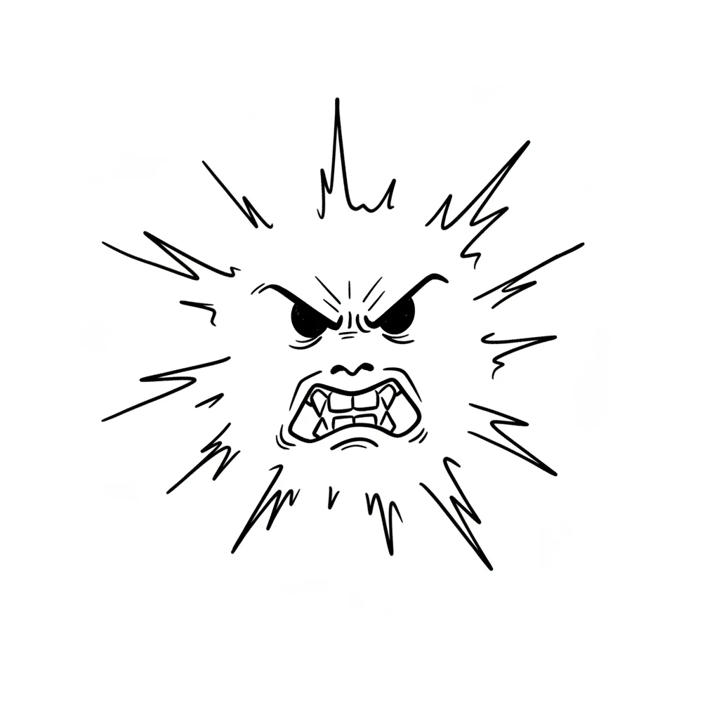 Schwarz-weiß-Cartoon eines wütenden Gesichts mit zähnefletschendem Mund und strahlenden Linien.