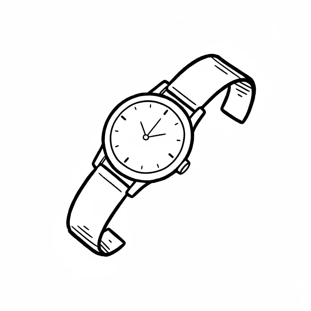 Eine einfache Schwarz-Weiß-Strichzeichnung einer Armbanduhr mit rundem Zifferblatt und Armband.
