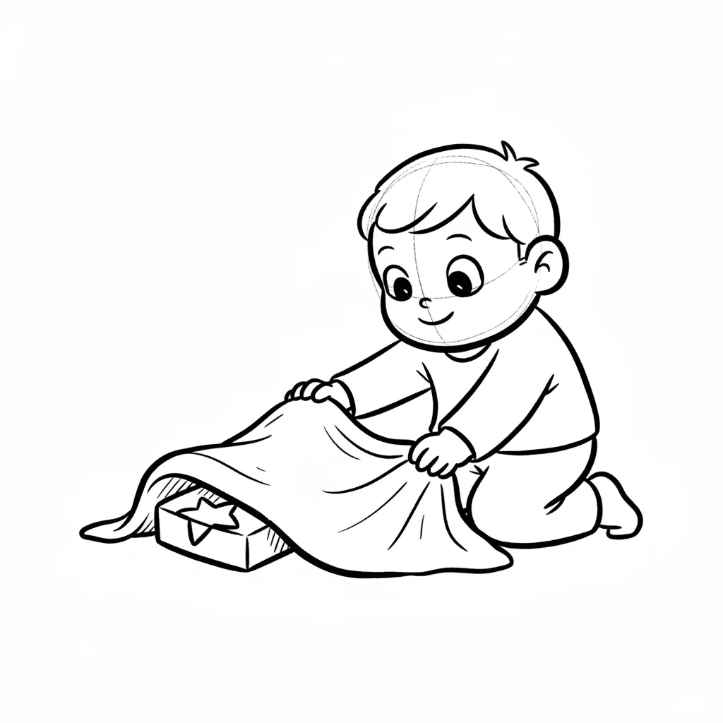 Ein lächelndes Kind lüftet eine Decke und entdeckt ein Geschenk. Schwarz-Weiß-Skizze.