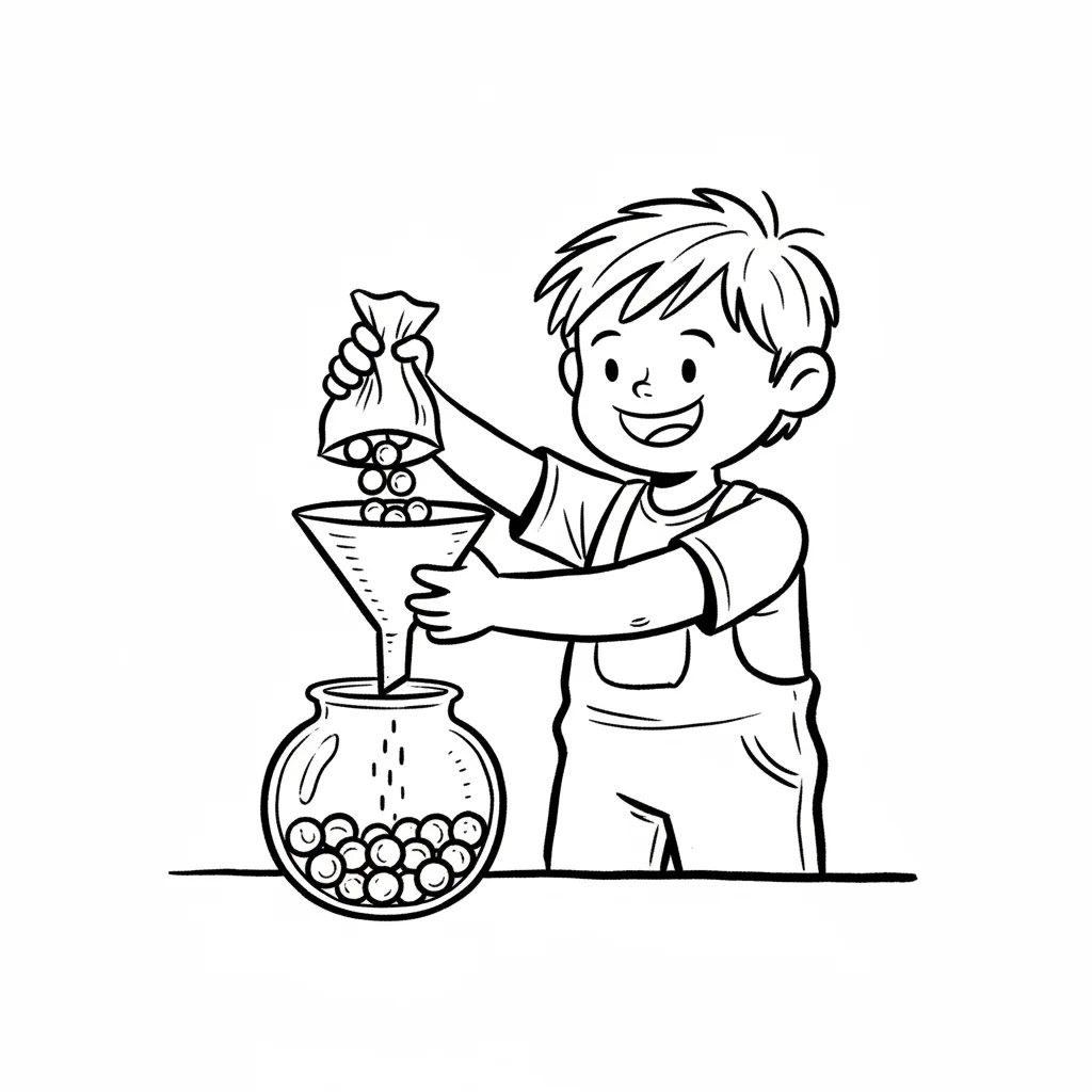 Ein lächelnder Junge füllt kleine Kugeln aus einem Beutel durch einen Trichter in ein Glasgefäß.