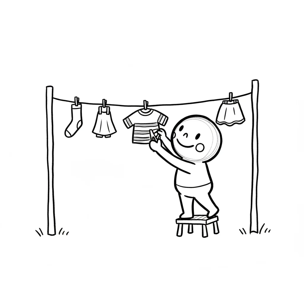 Ein lächelndes Kind hängt Wäsche auf einer Leine auf, steht dabei auf einem Hocker.