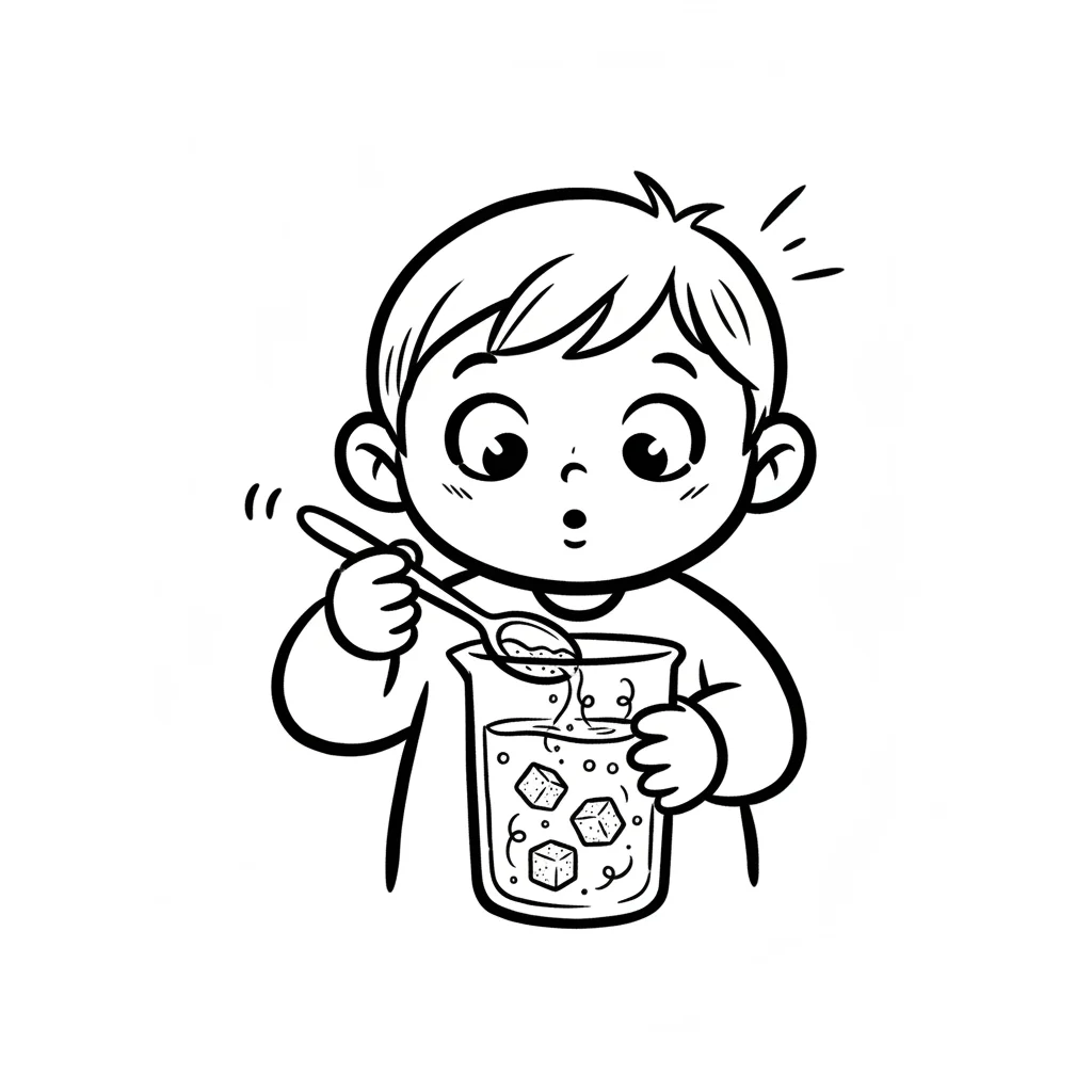 Niedlicher Cartoon-Junge rührt neugierig mit einem Löffel in einem Glas mit Eiswürfeln.