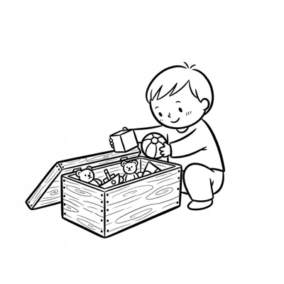Ein fröhliches Kind räumt Spielzeug wie Ball und Block in eine Holztruhe mit Teddybären.