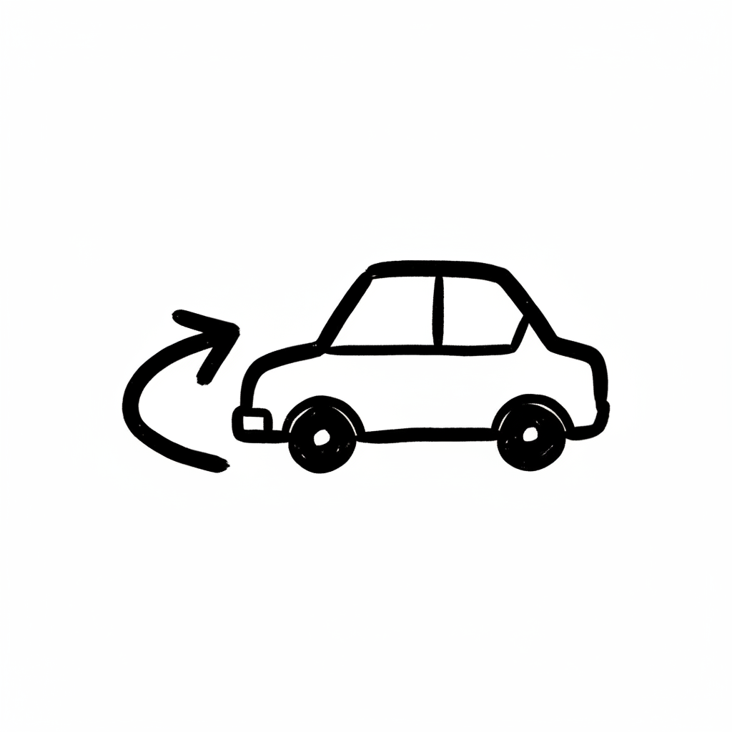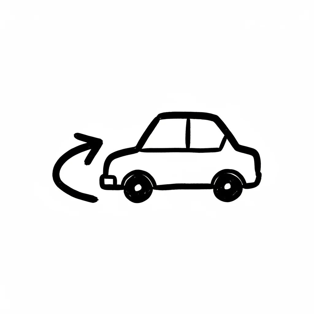 Handgezeichnetes Auto mit einem gebogenen Pfeil, der eine Drehung oder Wende symbolisiert.