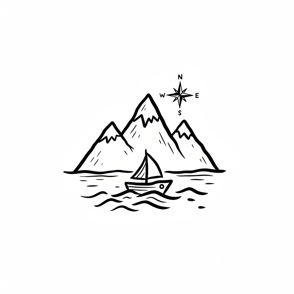 Handgezeichnete Skizze: Segelboot auf Wasser vor Bergen mit Kompassrose.