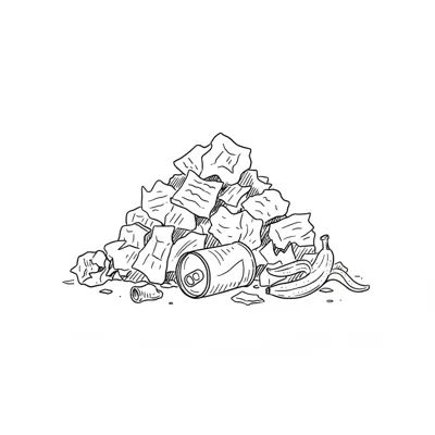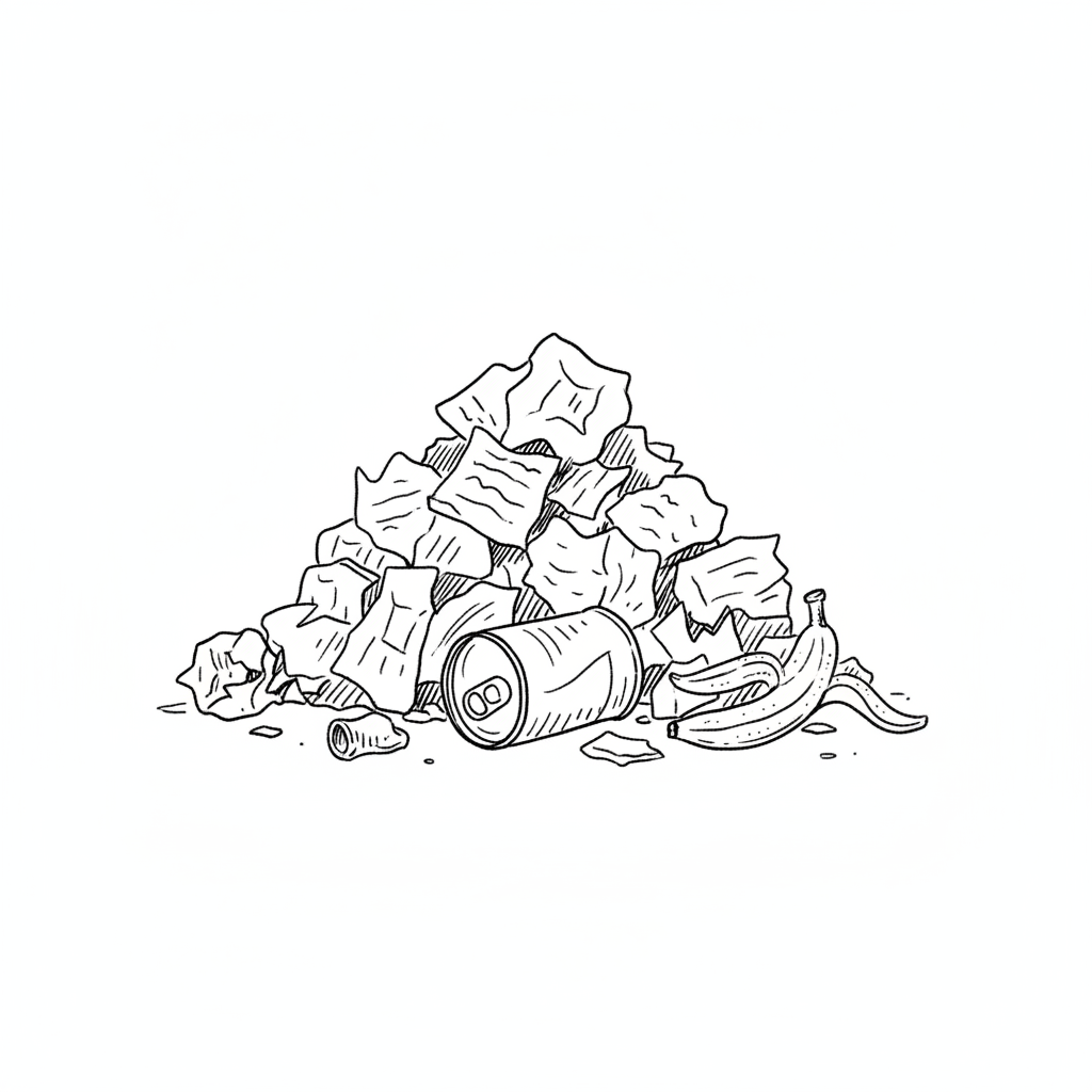 Schwarz-weiße Zeichnung eines Müllbergs mit zerknülltem Papier, Dose und Bananenschale.